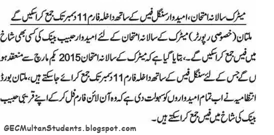 Matric Annual Examination - Last date for to submit admission forms is 11th December 2015 with single fees.